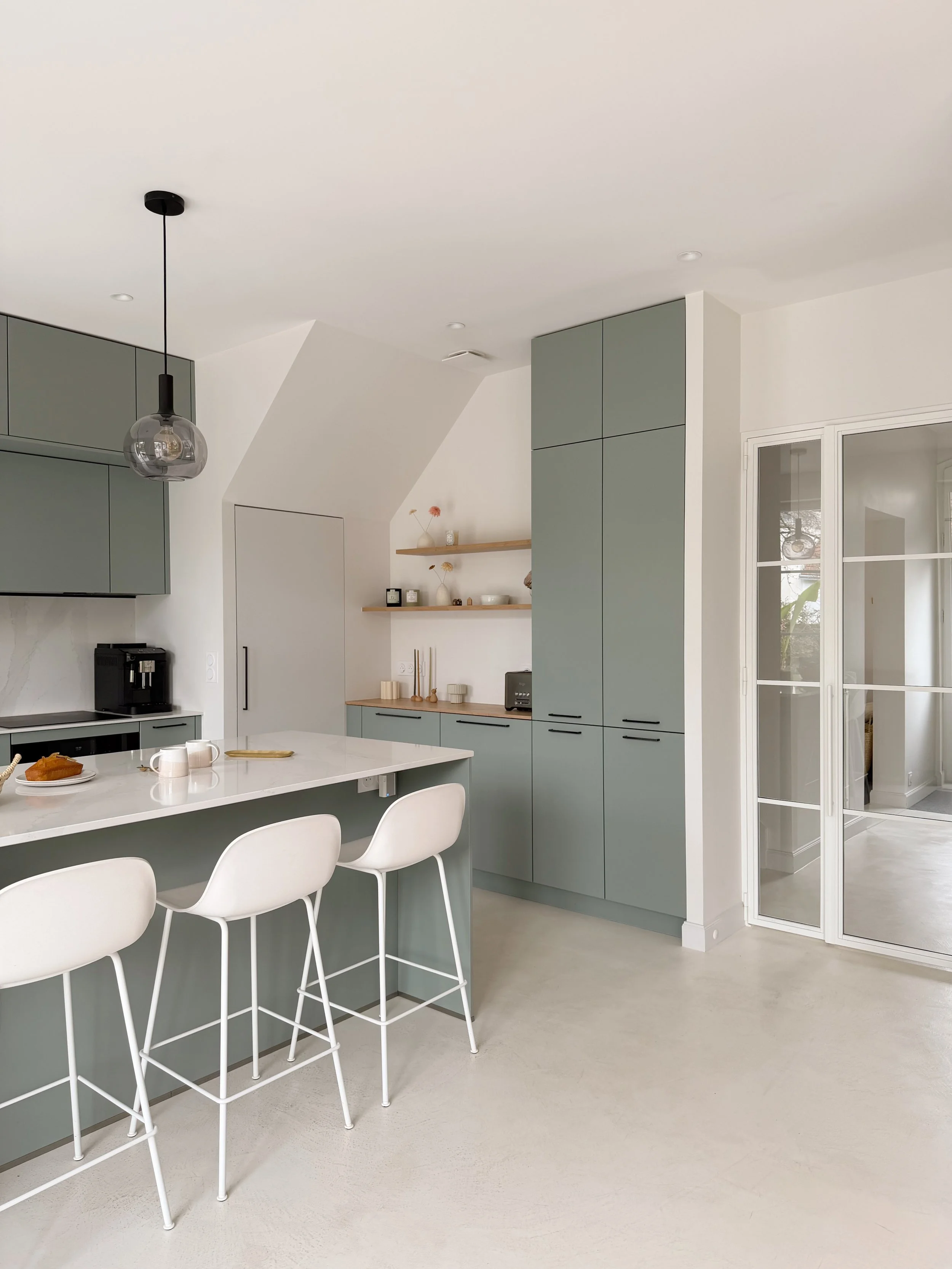 Au RDC, création d’un vestiaire avec WC et d’une grande pièce de vie avec cuisine ouverte.