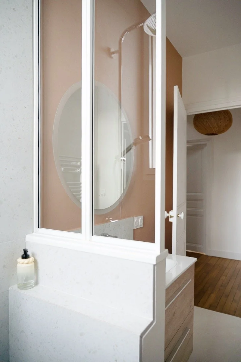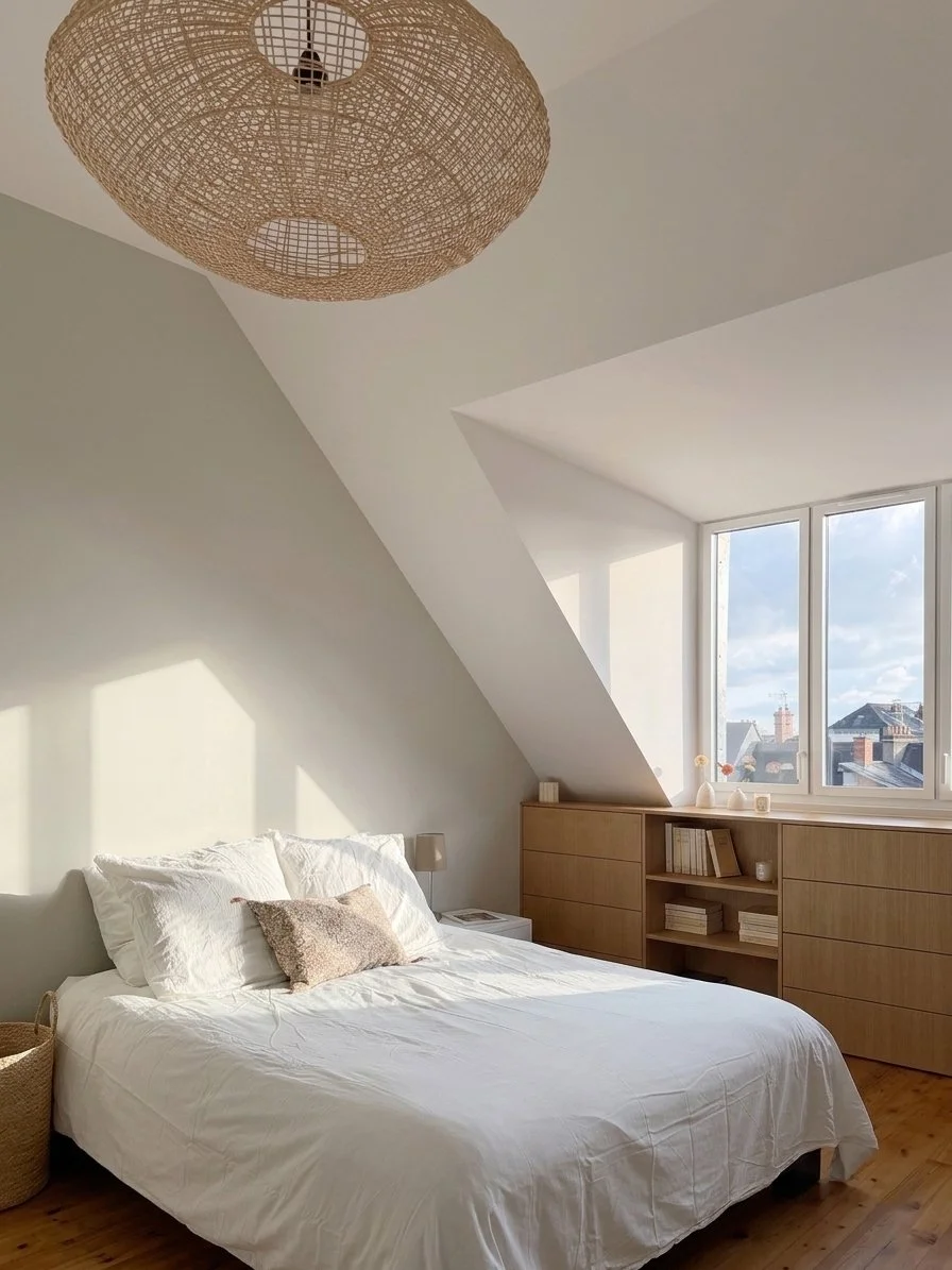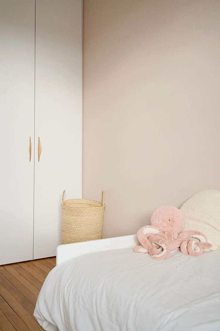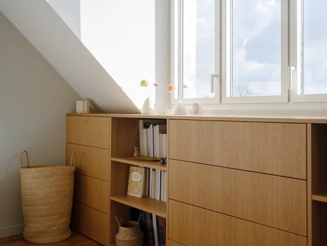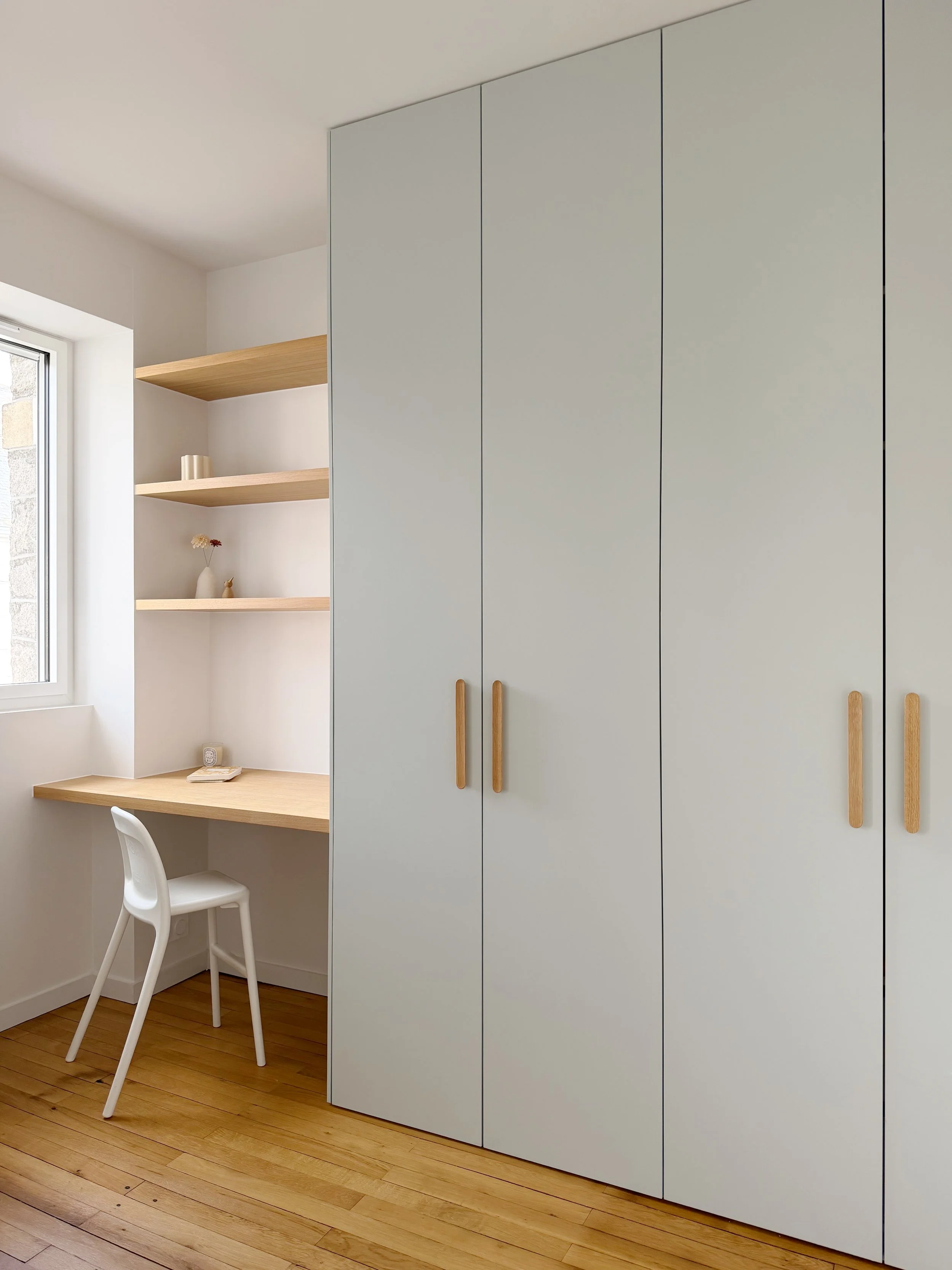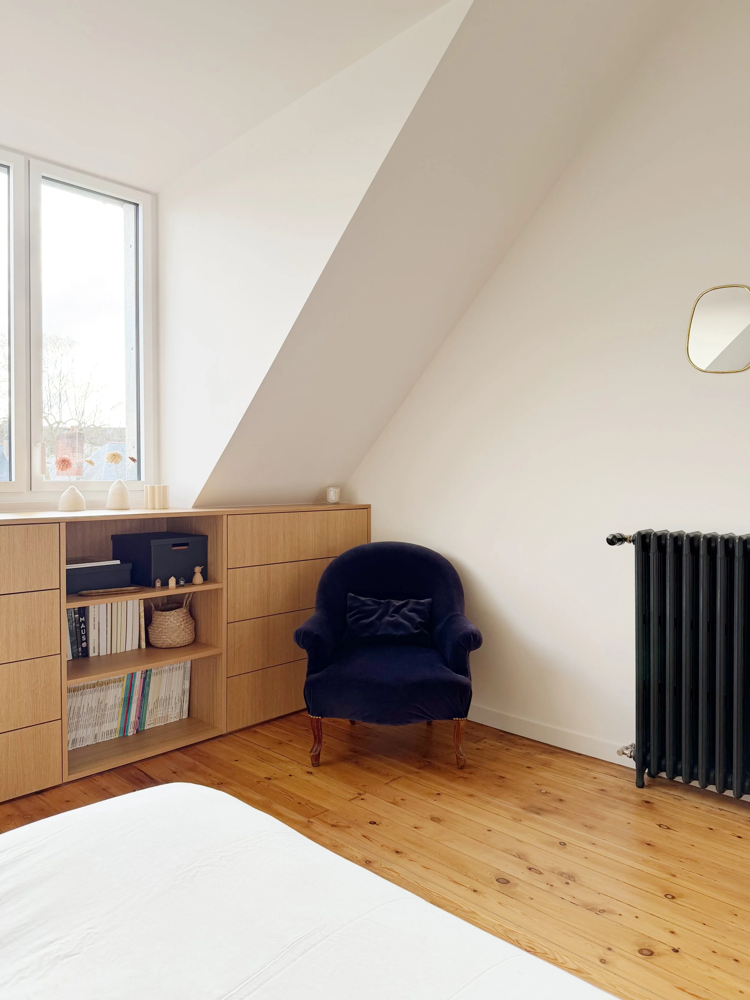 Le deuxième étage accueille une grande suite parentale dont les volumes ont été repensés afin d’intégrer un espace chambre, un dressing et un bureau). Une grande salle de bain a été créée dans un ancien grenier.