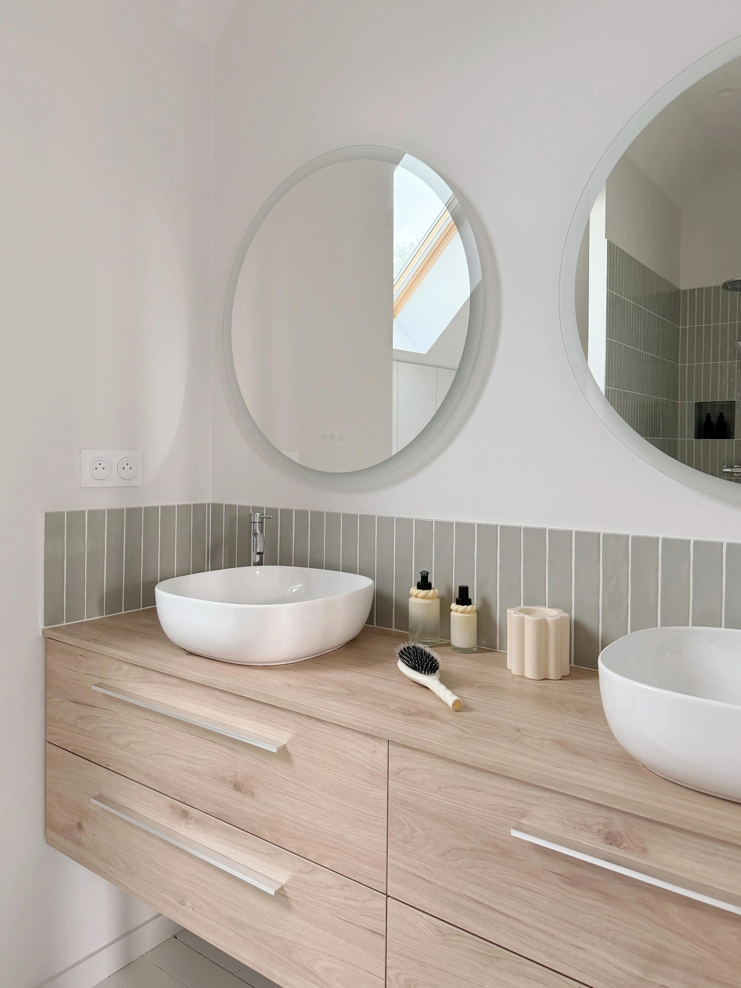 Proposition de matériaux, revêtements sols et murs, équipements sanitaires et ambiance colorielle pour chaque pièce.